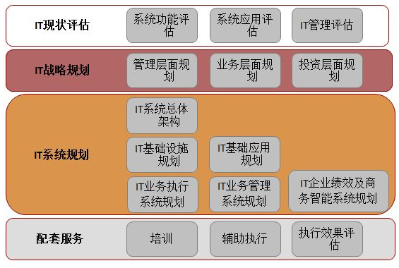 1、IT规划,包含企业战略、愿景与任务、目标识别,策略性业务规划、企业IT架构规划、IT执行计划规划